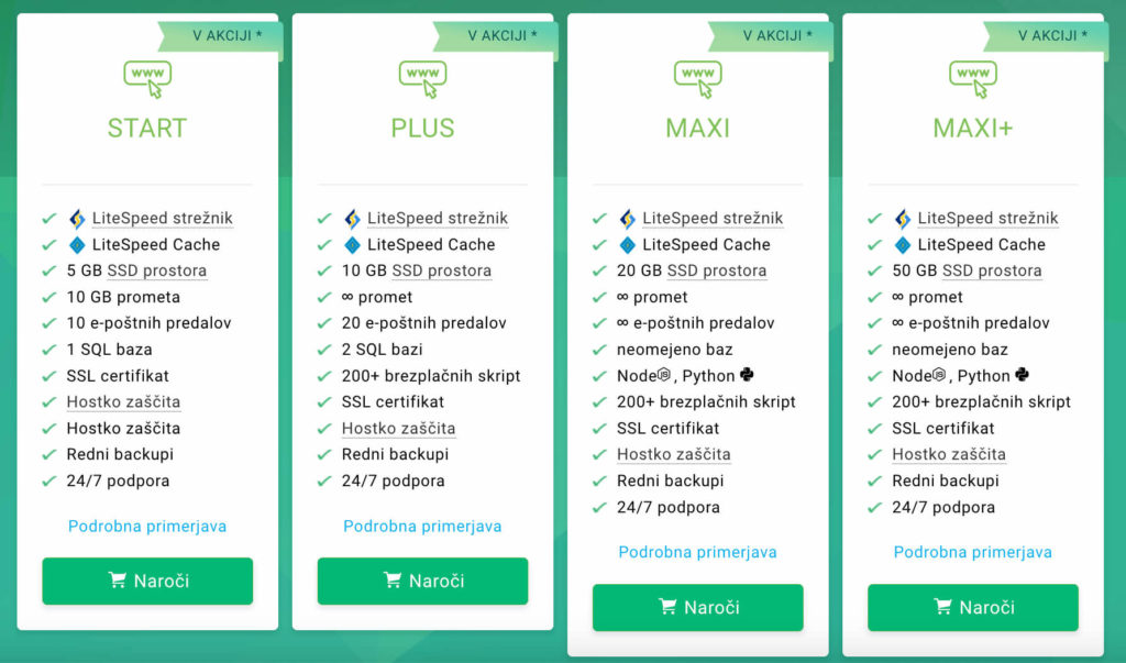 - Več funkcionalnosti: Plačljivi paketi ponujajo več naprednih funkcij, kot so podpora za večje število e-poštnih naslovov, možnost namestitve različnih sistemov za upravljanje vsebin (WordPress, Joomla, ipd.) in boljše orodja za upravljanje vašega spletnega mesta.